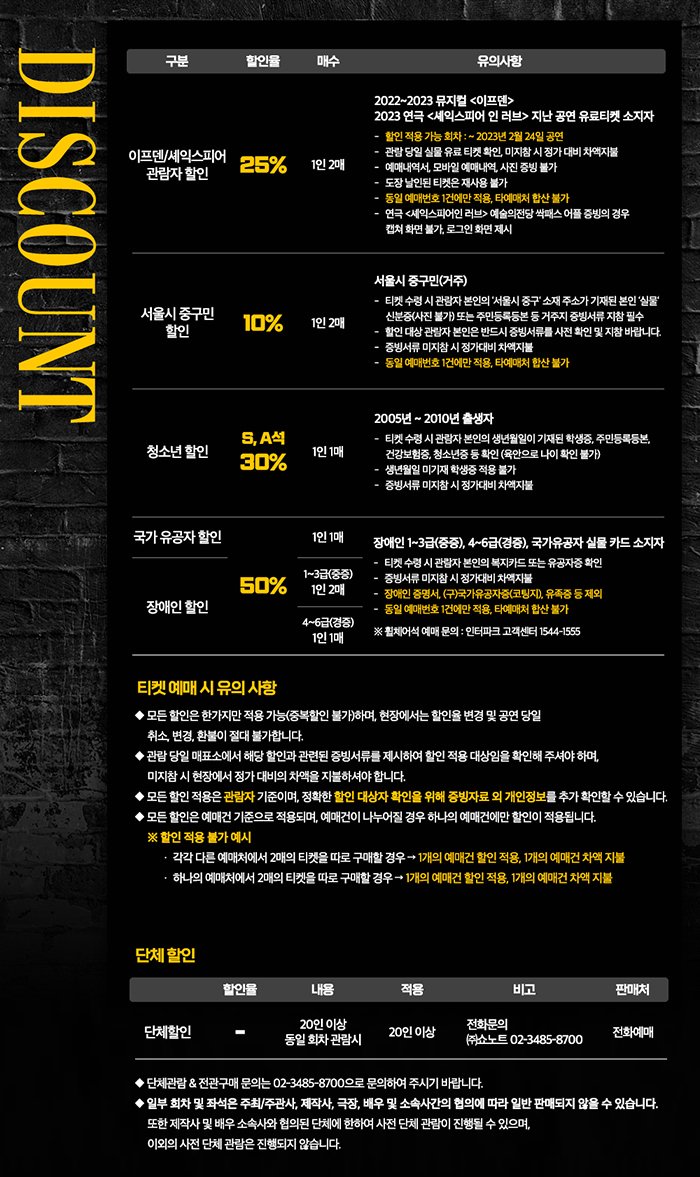 | 유효기간(이용조건) | 2022.11.17 - 2023.02.26 (예매한 공연 회차에 한해 이용가능) | ||||||||||||
