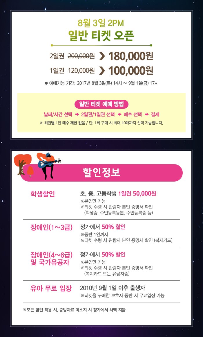 ※ 일반티켓 예매 시 1일권 100,000원 / 2일권 180,000원 (결제가)에 예매 가능하오니, 해당 할인을 반드시 선택해 주세요. 예매 시 참고하시기 바랍니다.