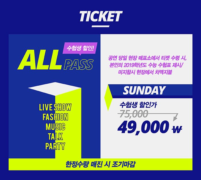 ※ 공연 당일 현장 매표소에서 티켓 수령 시, 본인의 2019학년도 수능 수험표 제시/ 미지참시 현장에서 차액지불.
