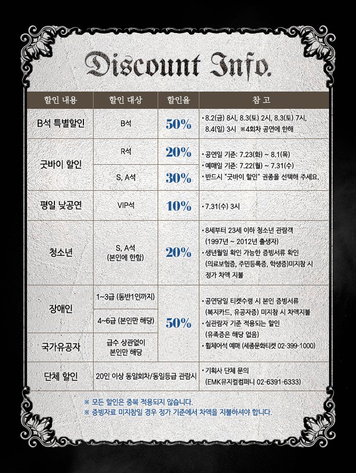 | 유효기간(이용조건) | 2019.06.15 - 2019.08.04 (예매한 공연 회차에 한해 이용가능) | ||||||||||||