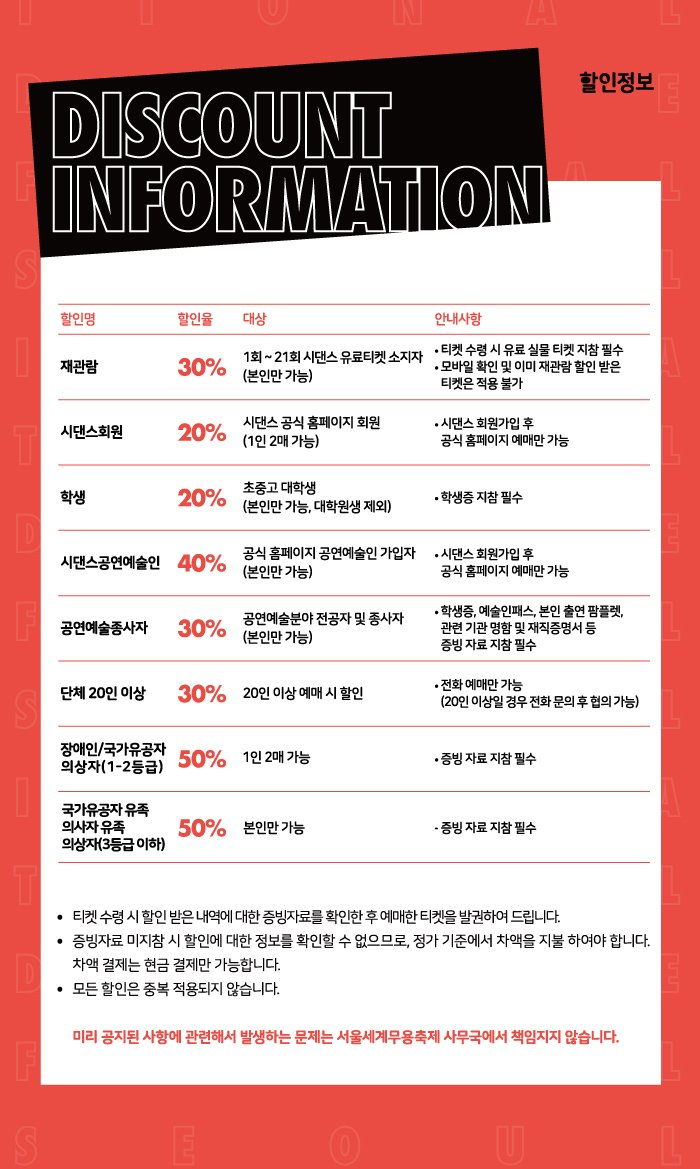 | 공연 관련 문의 | 02-3216-1185 / ticket@sidance.org | ||||||||||||