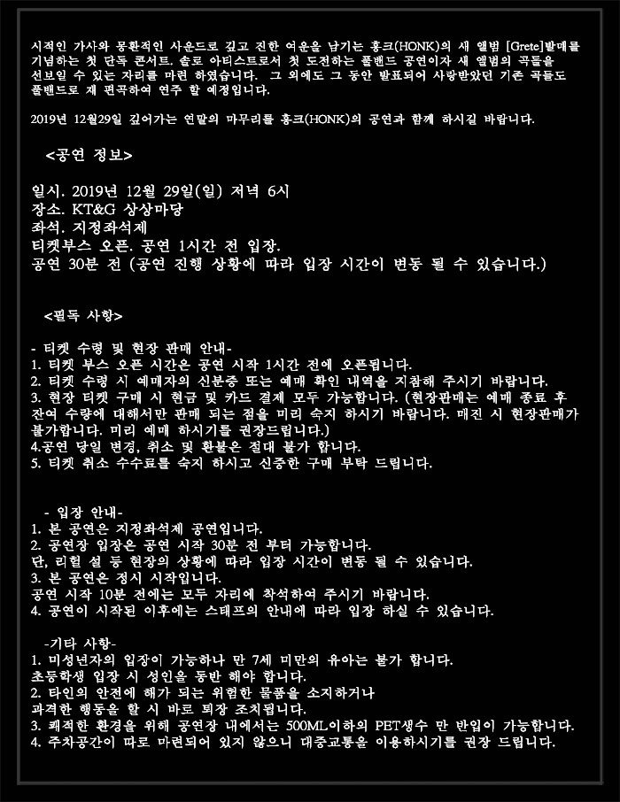 2019년 12월 29일 깊어 가는 연말의 마무리를 홍크(HONK)의 공연과 함께 하시길 바랍니다.