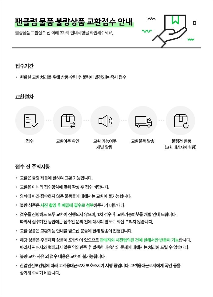 (1) 접수기간 : 원활한 교환 처리를 위해 상품 수령 후 불량이 발견되는 즉시 접수