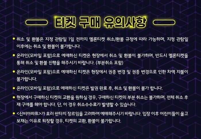 ※ 취소 및 환불은 지정 관람일 1일 전까지 멜론티켓 취소/환불 규정에 따라 가능하며 지정 관람일 이후로는 취소 및 환불이 불가합니다.
