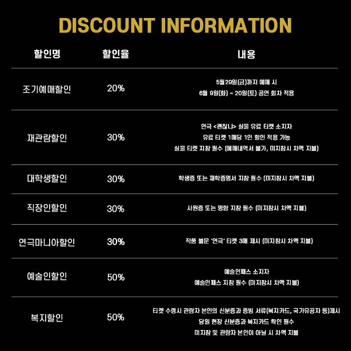 | 유효기간(이용조건) | 2020.06.09 - 2020.07.05 (예매한 공연 회차에 한해 이용가능) | ||||||||||||