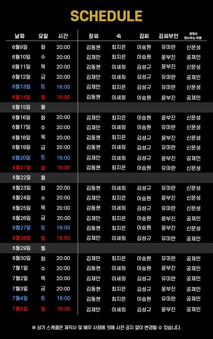 화~금 오후 8시 / 주말 오후 4시 (월 공연 없음)