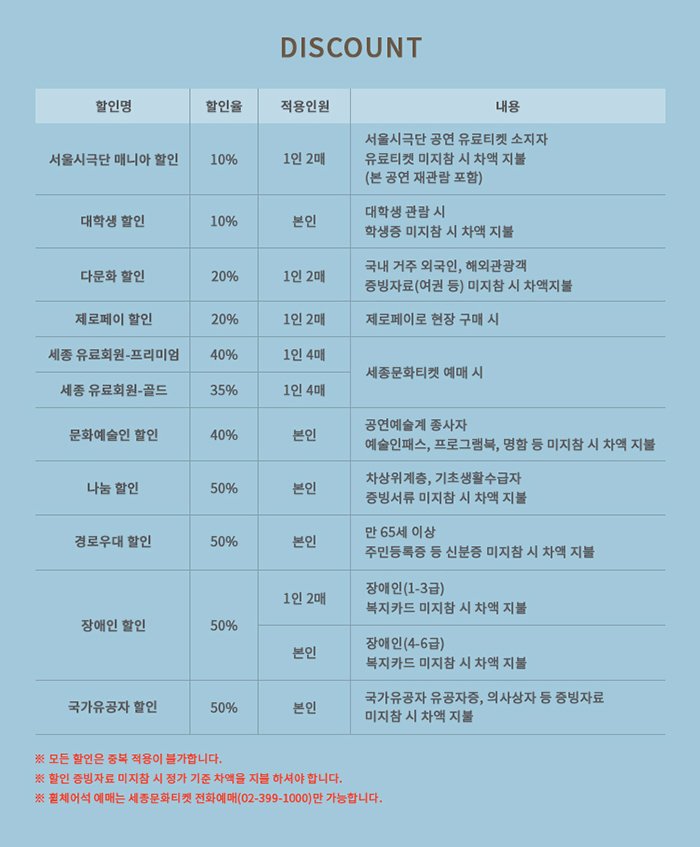 | 이용가능 장소 | 세종문화회관 S씨어터 | ||||||||||||