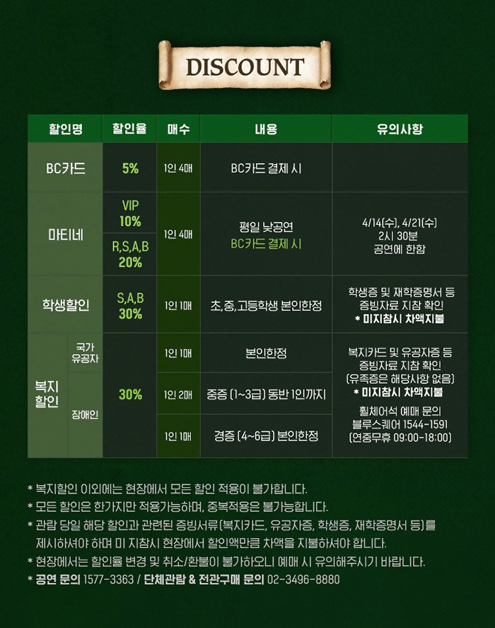 | 유효기간(이용조건) | 2021.02.16 - 2021.05.02 (예매한 공연 회차에 한해 이용가능) | ||||||||||||