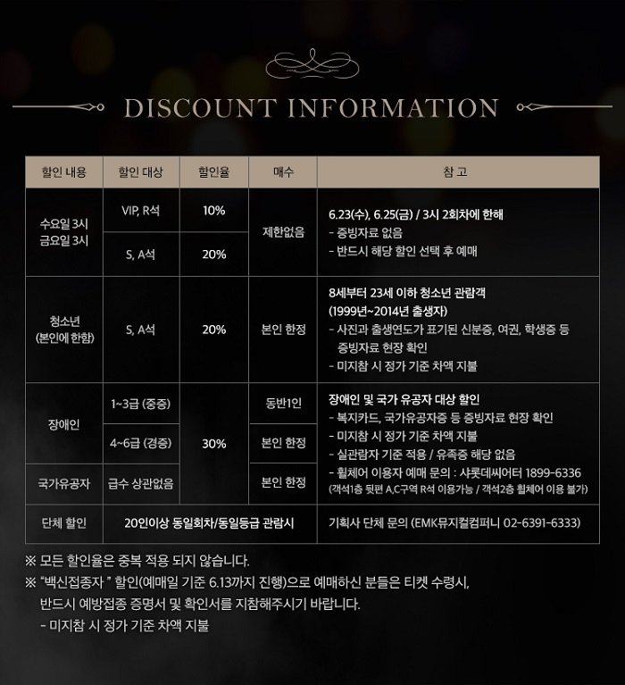 | 주최 / 기획 | (주)이엠케이뮤지컬컴퍼니 | ||||||||||||