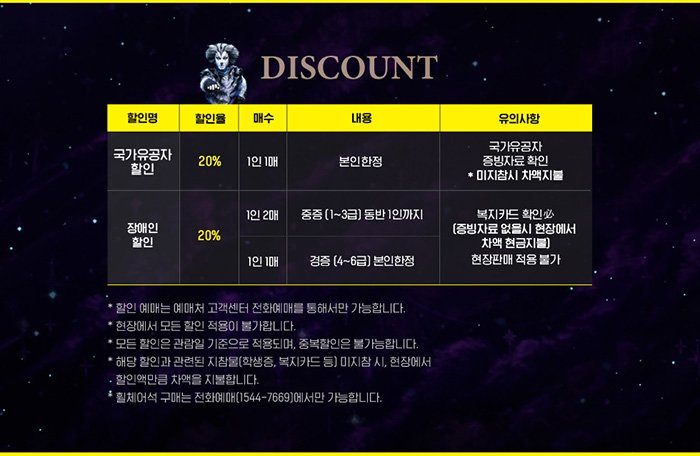 ※ 할인된 금액으로 예매를 하셔야하며 정가로 예매된 티켓은 현장에서 할인받으실 수 없으니 예매 시 유의바랍니다.