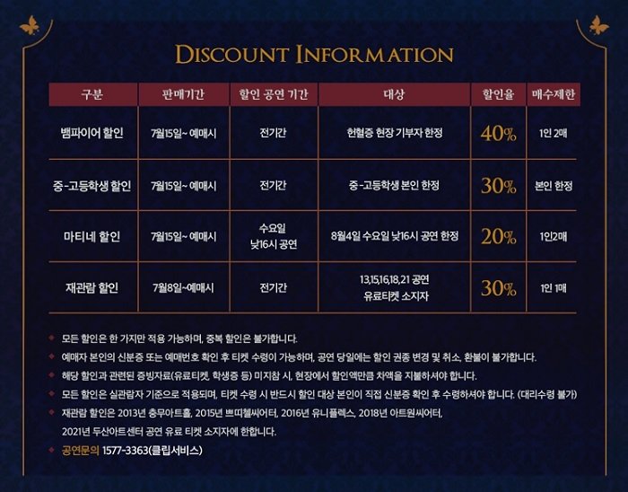 * 8월 10일 ~ 8월 22일 공연 : ~ 8월 6일 예매자에 한해 적용