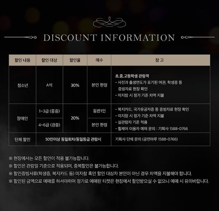 ※ 할인된 금액으로 예매를 하셔야 하며 정가로 예매된 티켓은 현장에서 할인 받으실 수 없으니 예매 시 유의바랍니다.