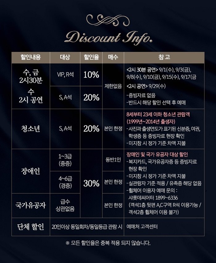 * 9.21(화), 9.22(수), 10.2(토)은 3시 1회 공연입니다.