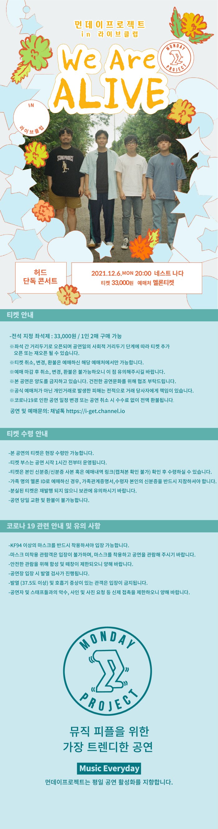 "먼데이프로젝트 in 라이브클럽 [허드 단독 콘서트]"에 관심 가져 주셔서 진심으로 감사드리며 모두가 건강한 모습으로 공연 날 뵙겠습니다.