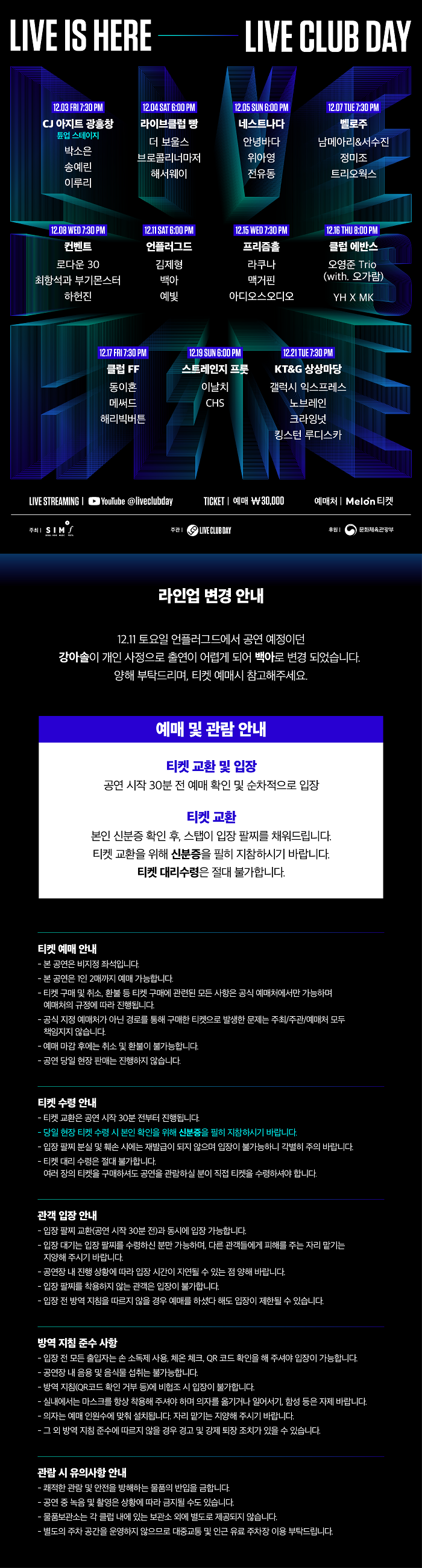 라이브클럽데이를 진행 중인 스태프 중에 코로나 확진이 의심되는 사람이 있어 PCR 검사를 받고 대기 중에 있습니다. 이에 예방 차원에서 금일(12/8, 수) 진행 예정인 라이브클럽데이 공연은 진행하지 않기로 하였습니다.