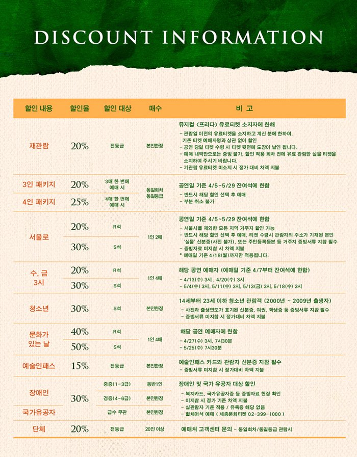 | 유효기간(이용조건) | 2022.03.01 - 2022.05.29 (예매한 공연 회차에 한해 이용가능) | ||||||||||||