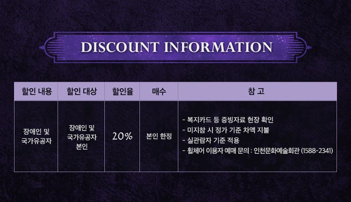 | 이용가능 장소 | 인천문화예술회관 대공연장 | ||||||||||||