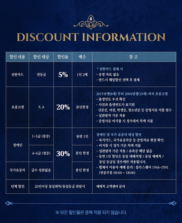 | 이용가능 장소 | 블루스퀘어 신한카드홀(구 인터파크홀) | ||||||||||||