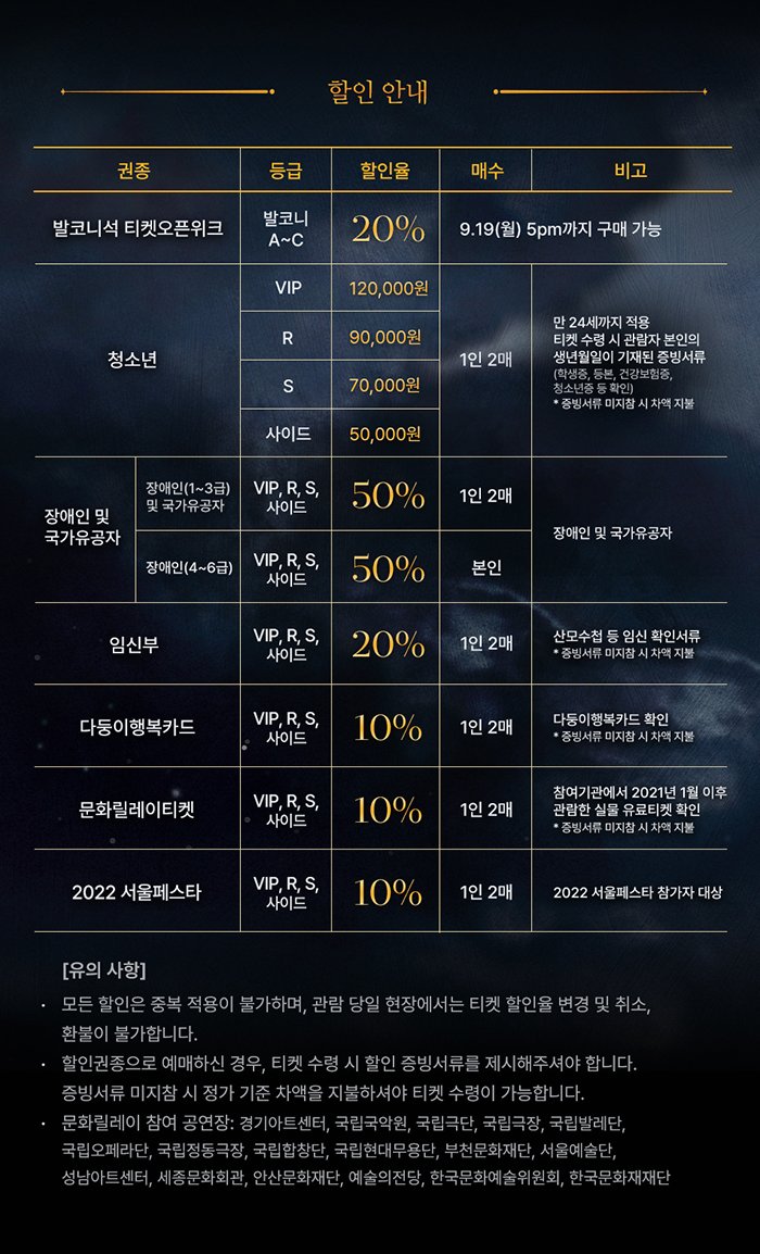 | 유효기간(이용조건) | 2022.10.07 - 2022.10.09 (예매한 공연 회차에 한해 이용가능) | ||||||||||||