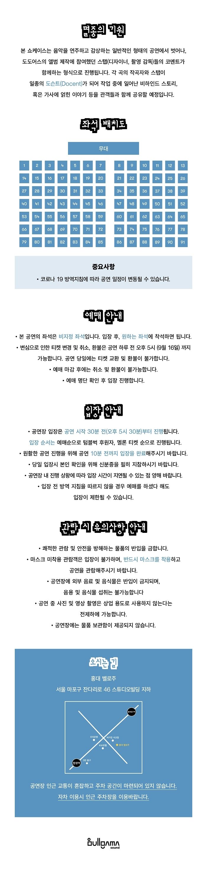 ※ 본 공연은 공연 당일 현장 도착 순으로 입장 및 착석이 가능합니다. 예매 시 참고부탁드립니다.