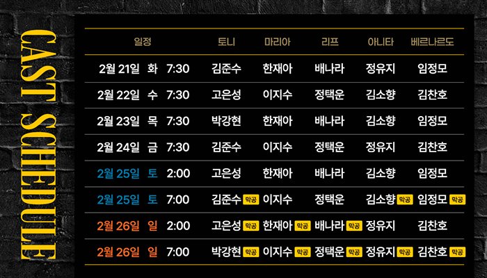 평일 7시 30분 / 주말 및 공휴일 2시, 7시 (월 공연 없음)