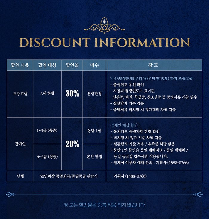 ※ 1층 S석은 시야제한석으로 공연 중 무대 및 출연배우의 모습이 제한적으로 보이는 좌석이며 위치에 따라 20~50%정도가 보이지 않아 공연 관람하기에 다소 불편을 느낄 수 있습니다. 또한, 2~3층 좌석은 극장컨디션에 따라 몇몇 장면이 관람하시기에 불편할 수 있으니 예매 시 유의 바랍니다.