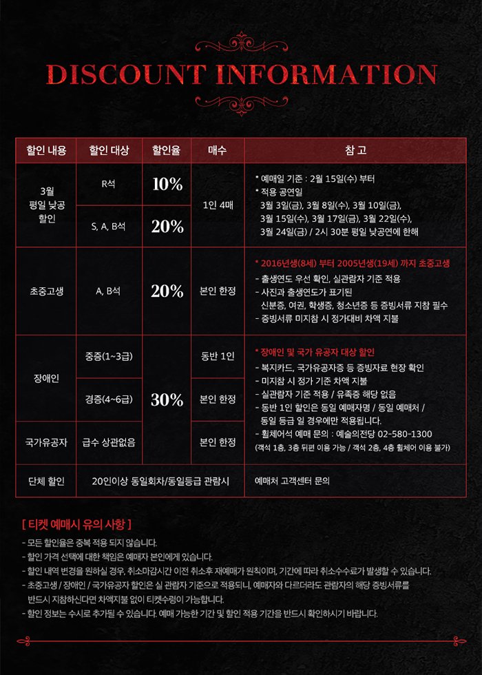 | 유효기간(이용조건) | 2023.01.12 - 2023.03.26 (예매한 공연 회차에 한해 이용가능) | ||||||||||||