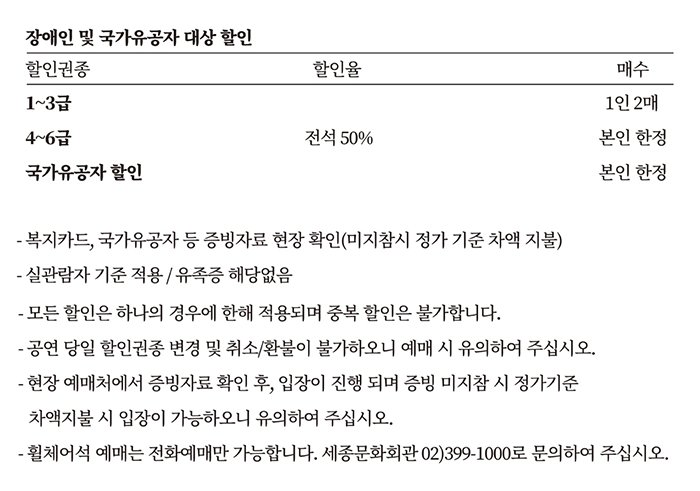 * 11월 22일(화) 14시부터 11월 28일(월) 23시 59분까지 무통장 입금 결제수단이 제한됩니다. 예매에 참고 부탁드립니다.