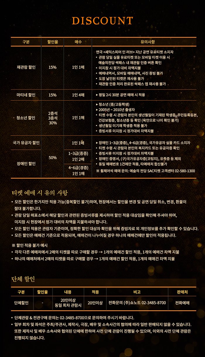 | 유효기간(이용조건) | 2023.01.28 - 2023.03.26 (예매한 공연 회차에 한해 이용가능) | ||||||||||||