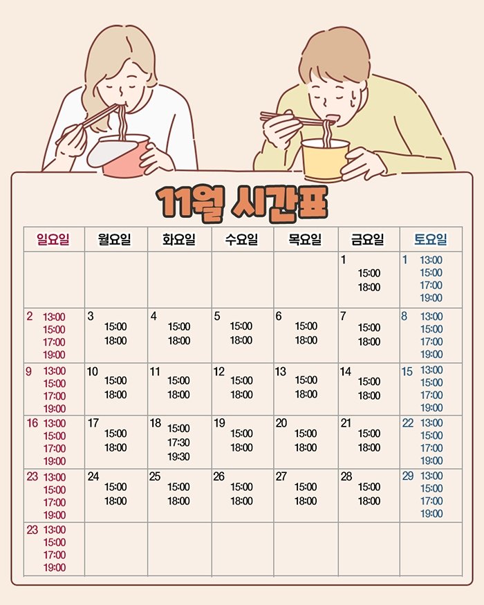 *10/03~10/10(평일) : 1:00,3:00,5:00,7:00