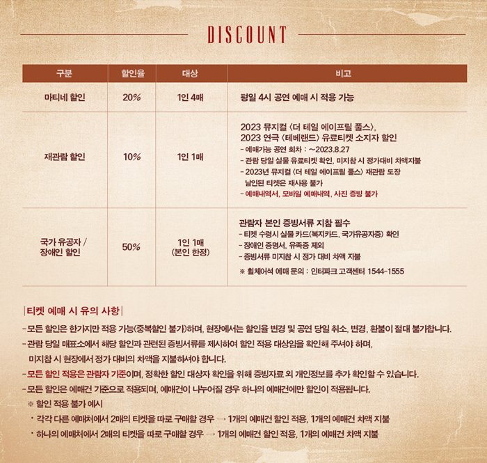 | 유효기간(이용조건) | 2023.06.07 - 2023.08.27 (예매한 공연 회차에 한해 이용가능) | ||||||||||||