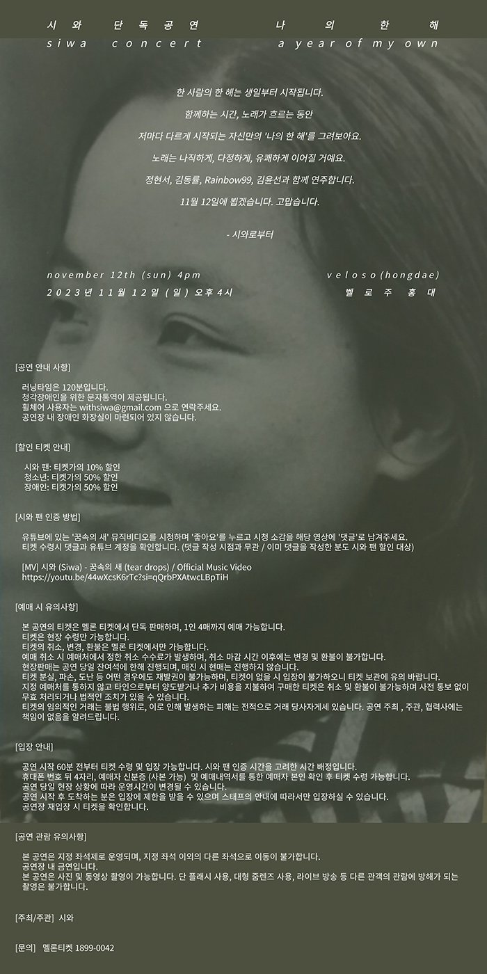 *시와 팬 인증 방법: Youtube ‘시와 (Siwa) - 꿈속의 새 (tear drops)’ MV 시청하며 ‘좋아요’를 누르고 감상 소감을 해당 영상에 댓글로 남기기. 티켓 수령시 Youtube 계정과 댓글 확인