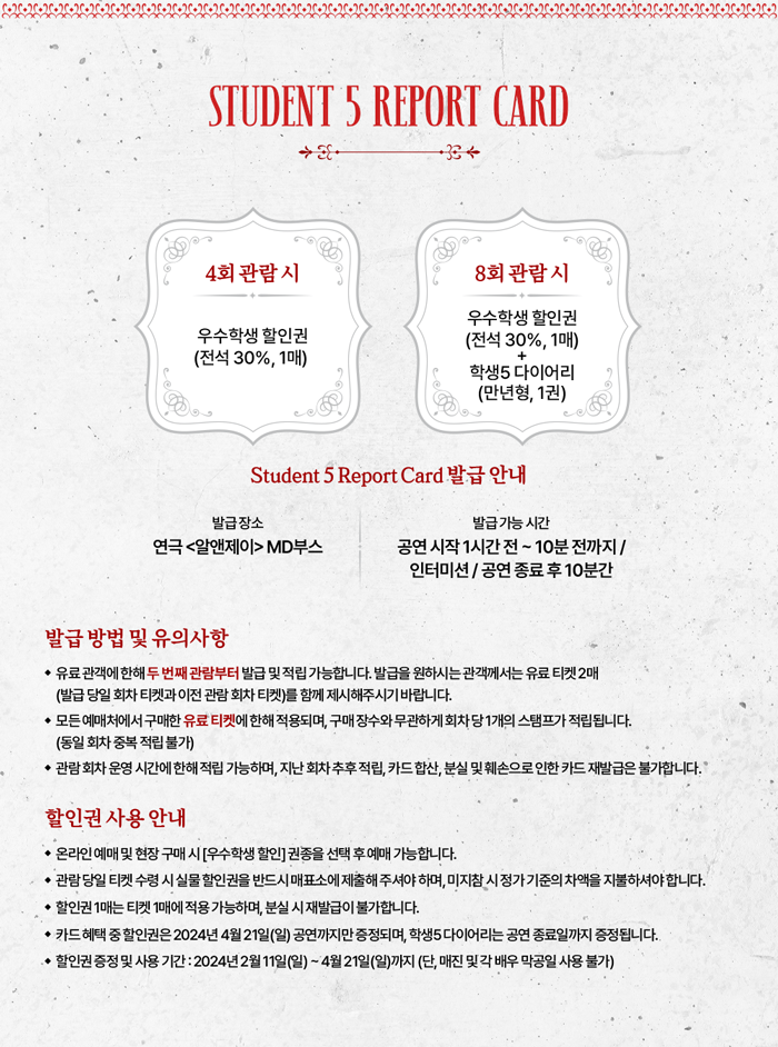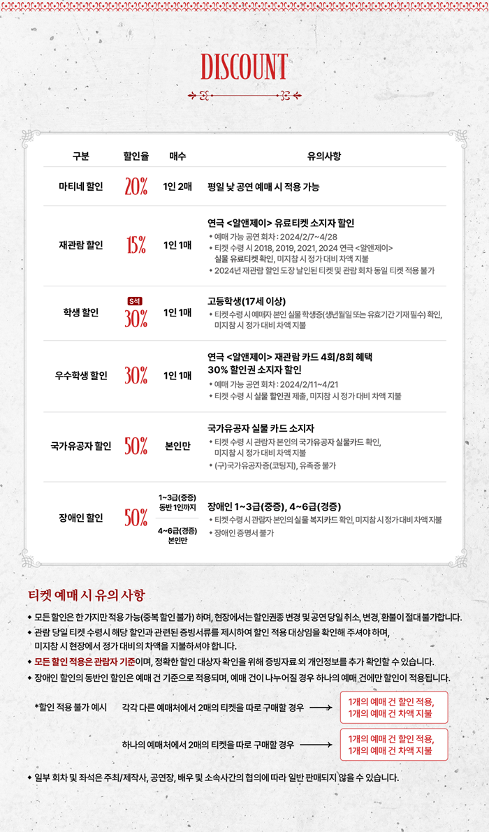 | 유효기간(이용조건) | 2024.02.07 - 2024.04.28 (예매한 공연 회차에 한해 이용가능) | ||||||||||||