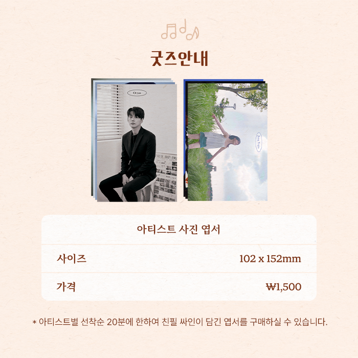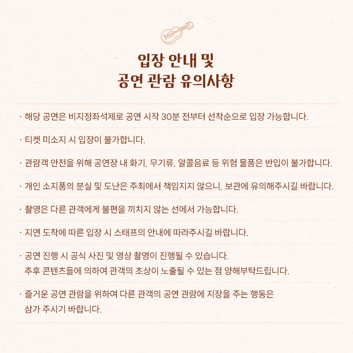 ※ 본 공연은 공연 당일 현장 도착 순으로 입장 및 착석이 가능합니다. 예매 시 참고 부탁드립니다.
