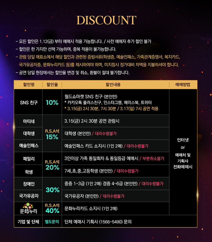 | 공연 관련 문의 | ㈜월드쇼마켓 1566-5490 www.wsmi.co.kr | ||||||||||||