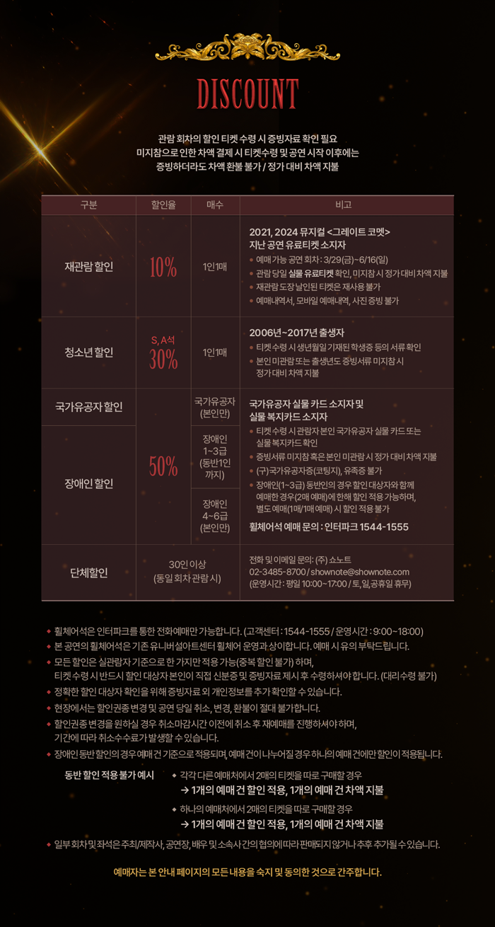 | 유효기간(이용조건) | 2024.03.26 - 2024.06.16 (예매한 공연 회차에 한해 이용가능) | ||||||||||||
