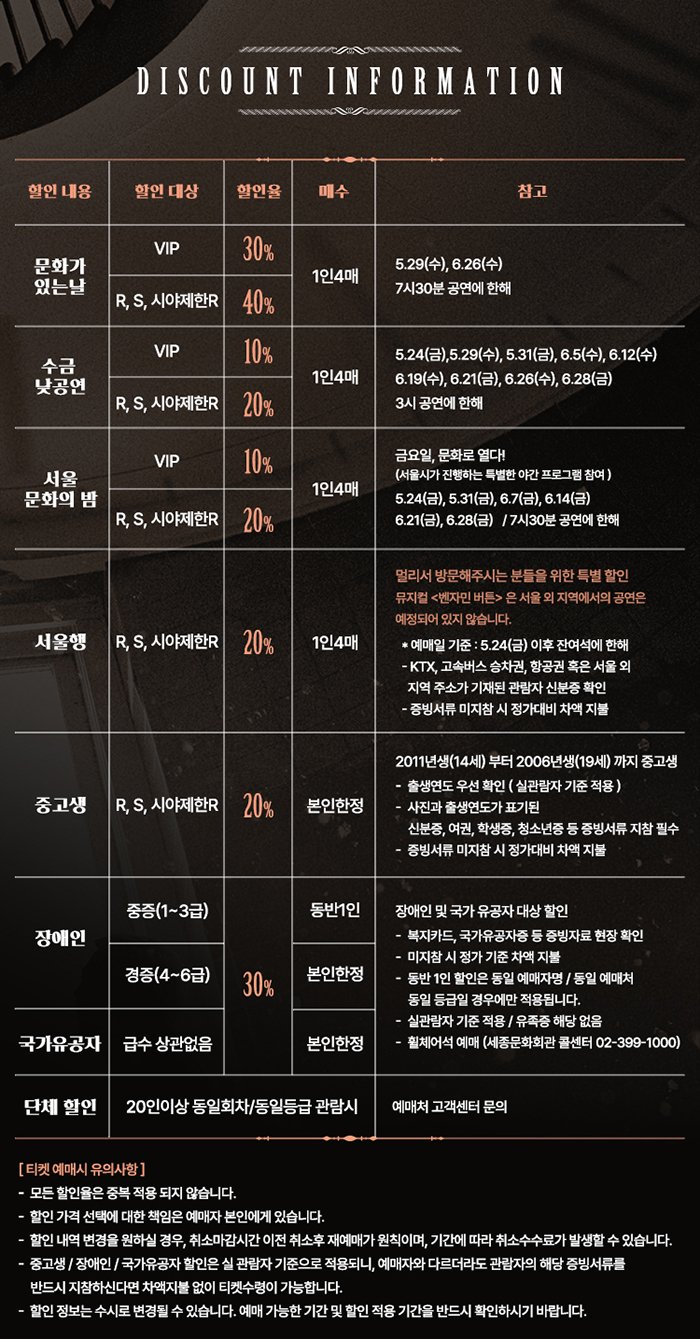단체 예약: 예매처 고객센터 (20인이상, 동일회차/동일등급 관람시)