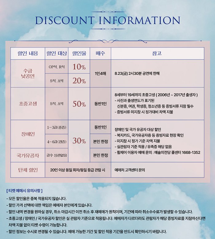 문 의 : 멜론티켓 1899-0042 (20인이상, 동일회차/동일등급 관람시)