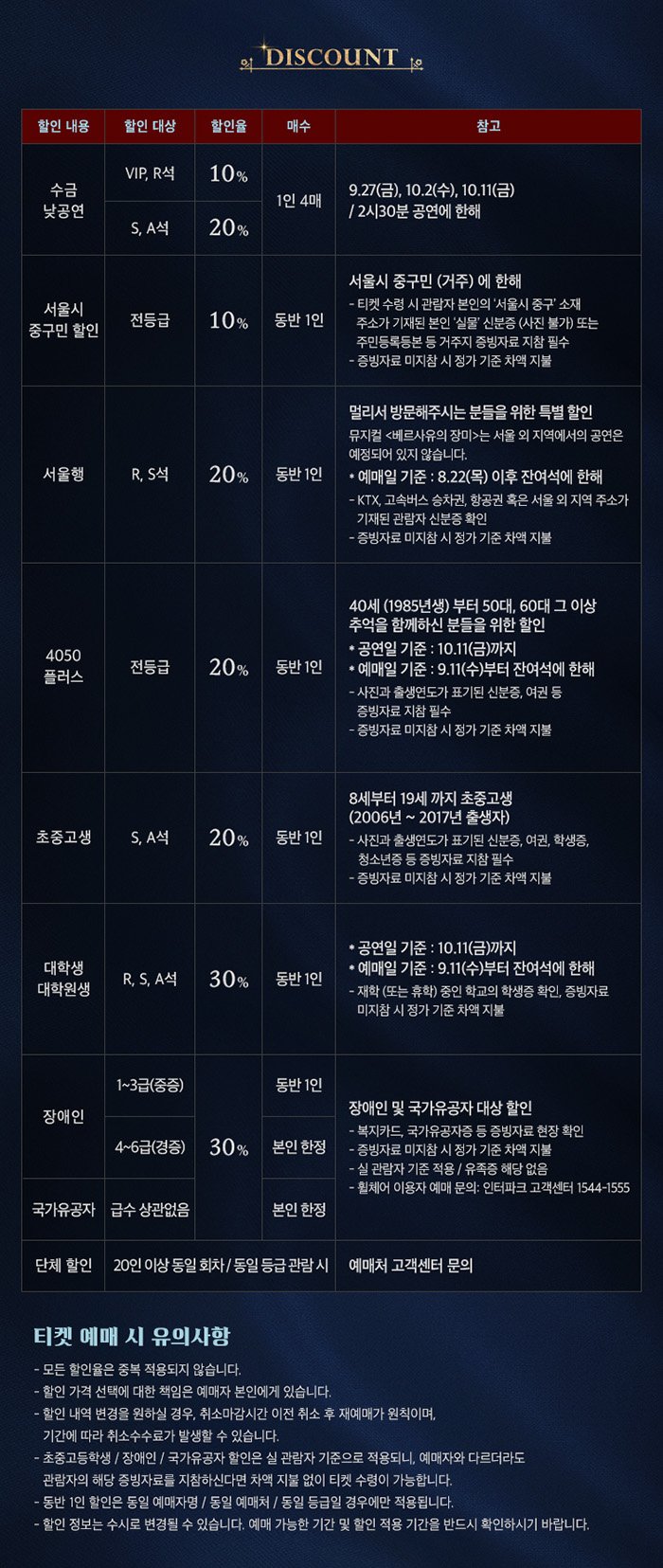 | 유효기간(이용조건) | 2024.07.16 - 2024.10.13 (예매한 공연 회차에 한해 이용가능) | ||||||||||||