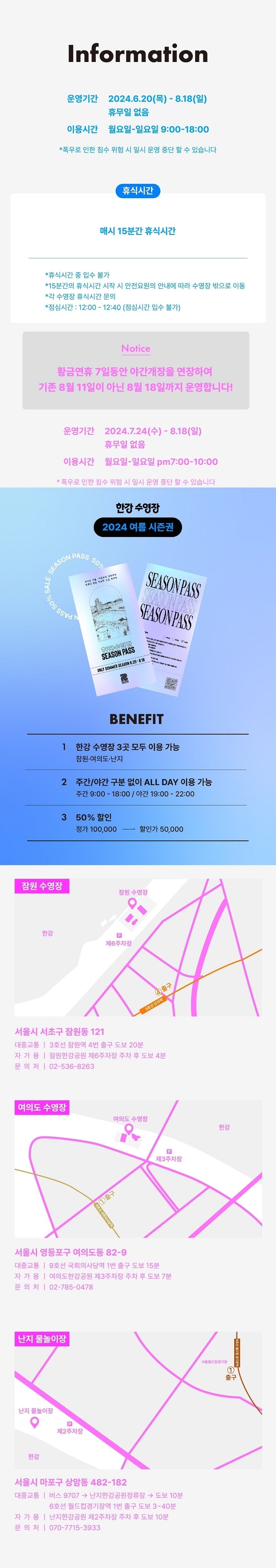 문 의 : 잠원 수영장 02-536-8263 / 여의도 수영장 02-785-0478 / 난지 물놀이장 070-7715-3933