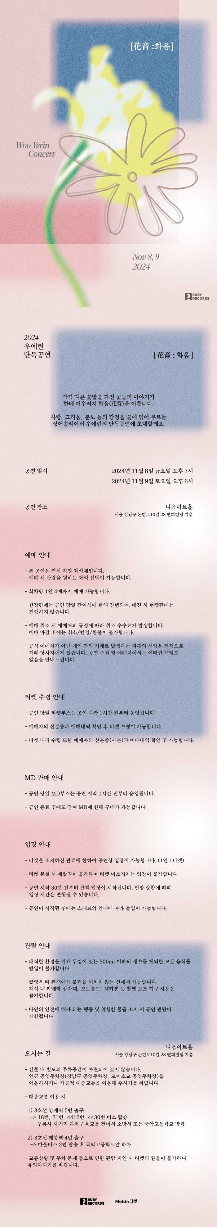 각기 다른 꽃말을 가진 꽃들의 이야기가 한데 어우러져 화음(花音)을 이루는 싱어송라이터 우예린의 단독공연에 초대합니다.