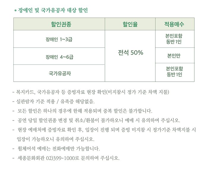| 유효기간(이용조건) | 2024.12.31 - 2024.12.31 (예매한 공연 회차에 한해 이용가능) | ||||||||||||