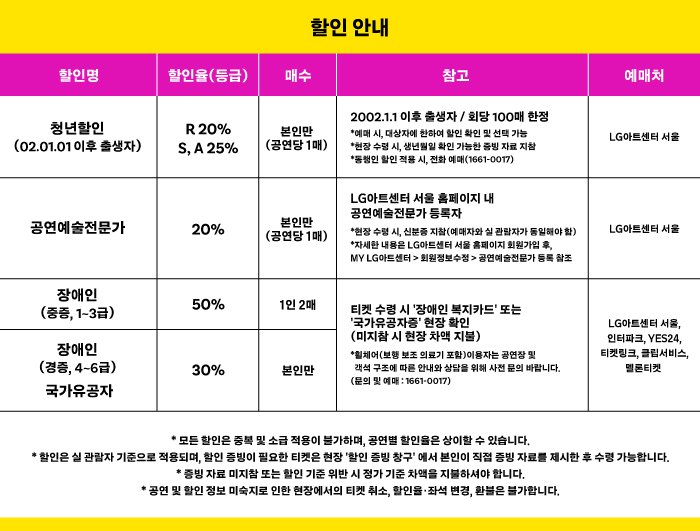 | 이용가능 장소 | LG아트센터 서울 LG SIGNATURE 홀 | ||||||||||||