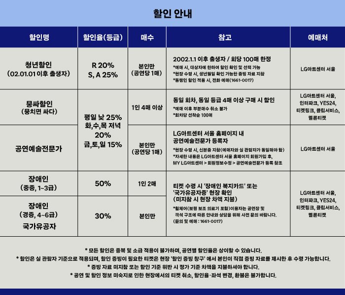 | 이용가능 장소 | LG아트센터 서울 LG SIGNATURE 홀 | ||||||||||||