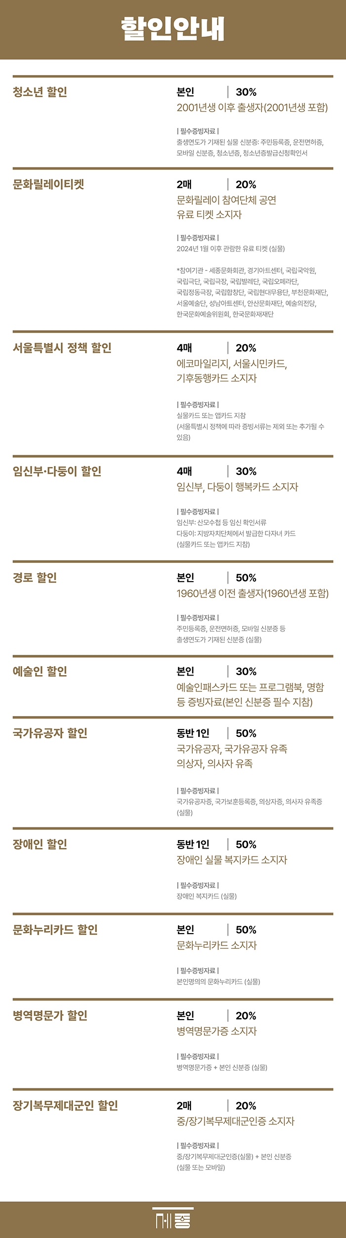 ※ 본 공연은 공연 전일 오후 5시까지 예매 및 취소 가능합니다. 예매 시 참고부탁드립니다.