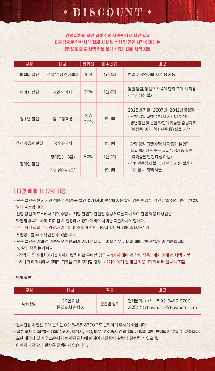 | 유효기간(이용조건) | 2025.05.01 - 2025.07.13 (예매한 공연 회차에 한해 이용가능) | ||||||||||||