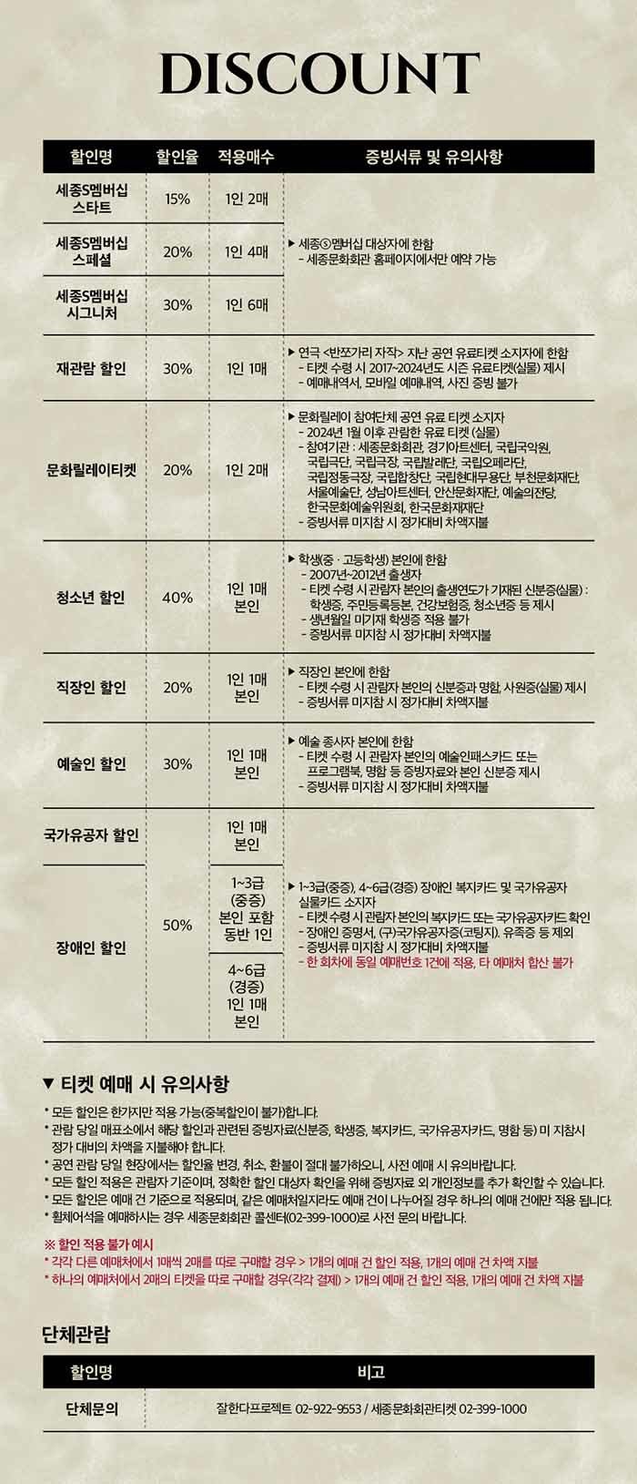 | 유효기간(이용조건) | 2025.04.04 - 2025.04.20 (예매한 공연 회차에 한해 이용가능) | ||||||||||||