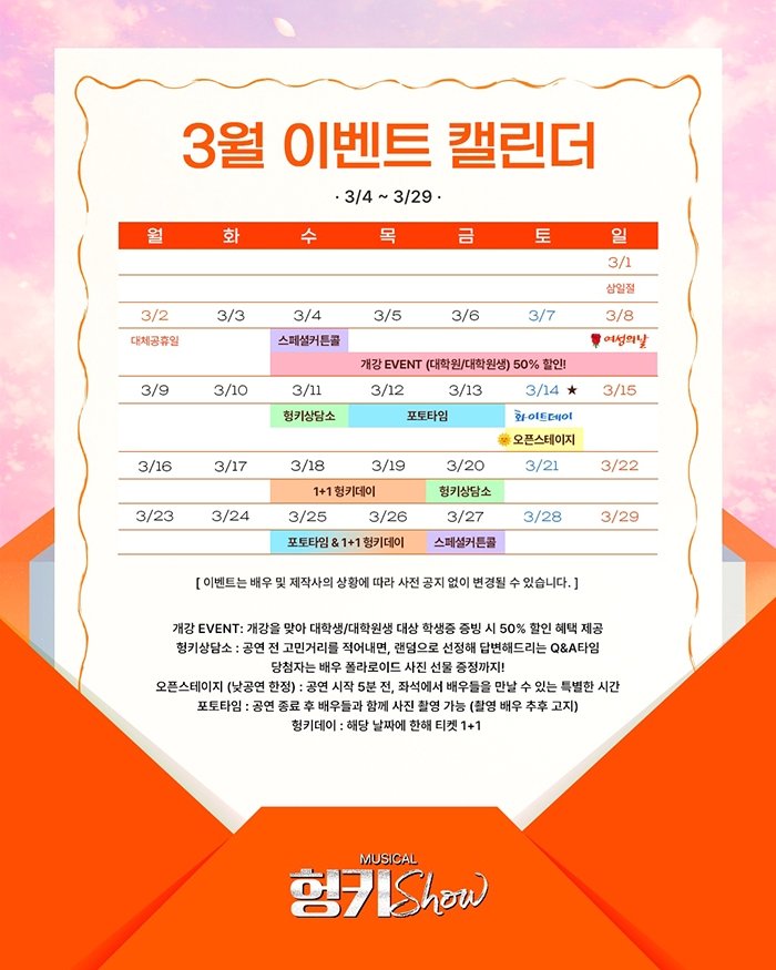 수,목,금 오후 8시 / 토,공휴일 오후 3시, 7시 / 일 오후 3시 (월,화 공연없음)