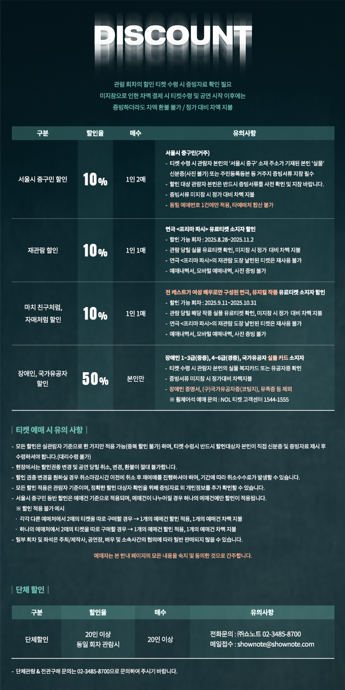 | 유효기간(이용조건) | 2025.08.27 - 2025.11.02 (예매한 공연 회차에 한해 이용가능) | ||||||||||||