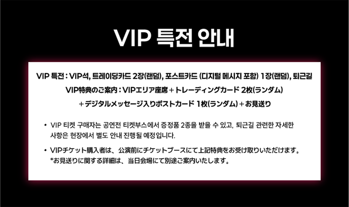 VIP 특전 : VIP석, 트레이딩카드 2장(랜덤), 포스트카드 (디지털 메시지 포함) 1장(랜덤), 퇴근길